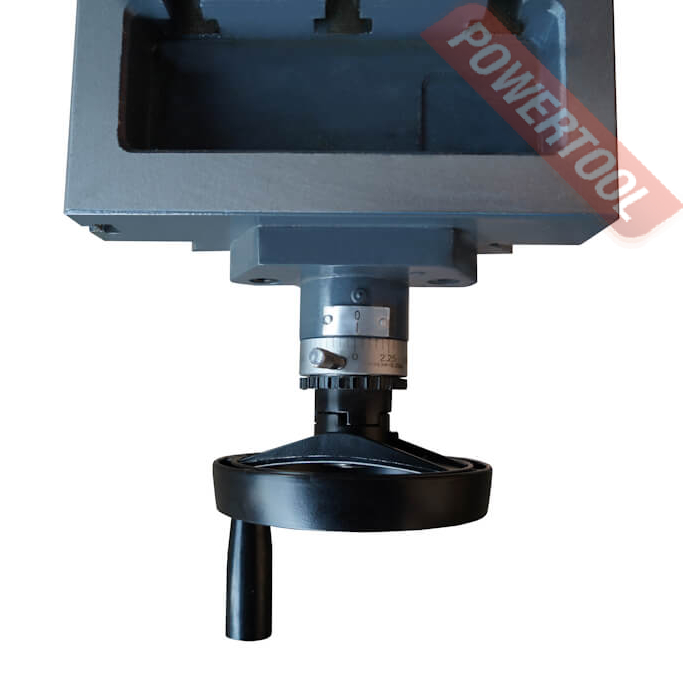 Скорость вращения шпинделя регулируется с помощью перекидывания ремней в блоке ременных шкивов. Схема положения ремней с диапазоном оборотов расположена с правой стороны станка. Широкий диапазон оборотов шпинделя от 100 до 2150 об/мин обеспечивает качественное сверление материалов.