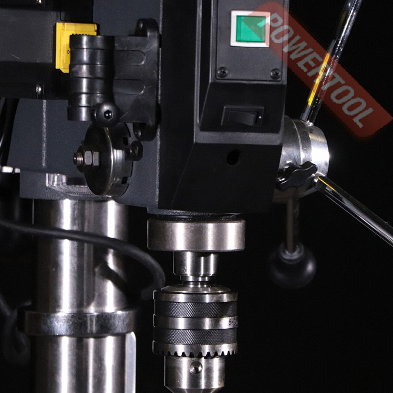 Сверлильный станок, 1100 Вт, 380 В, max диаметр сверления 25 мм, частота вращения шпинделя 180-3000 об/мин, 16 передач, ступенчатая регулировка оборотов, конус шпинделя КМ-3, посадочное сверлильного патрона JT3, диапазон хвостовиков для патрона 5-20 мм, ход пиноли шпинделя 80 мм, вылет шпинделя 215 мм, шпиндель-стол 720 мм, шпиндель-основание 1220 мм, диаметр стойки 80 мм, размер основания 485х275 мм, размер стола 350х355 мм, наклон стола влево/вправо 45/45 градусов, угол поворота стола 360 градусов, 2 Т-образных паза 16 мм, подсветка рабочей зоны, габариты 850х380х1635 мм, вес 85 кг, в комплекте патрон JT3 5-20 мм, оправка КМ-3/JT3, защитный экран, набор инструментов.