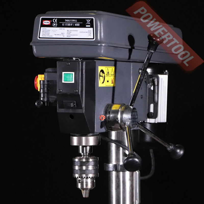 Сверлильный станок по металлу PROMA E-1720F/400 - это мощный и многофункциональный станок для работы в условиях производств или ремонтных мастерских. Предназначен для образования и обработки отверстий в заготовках из металлов и др. материалов. Может выполнять следующие основные операции: сверление, зенкерование, развертывание. Шпиндель оснащен конусом MK-3 в который можно поставить патрон на оправке или инструмент с конусом морзе. Вращение шпинделя осуществляется от двигателя через ременную передачу, которая закрыта кожухом.