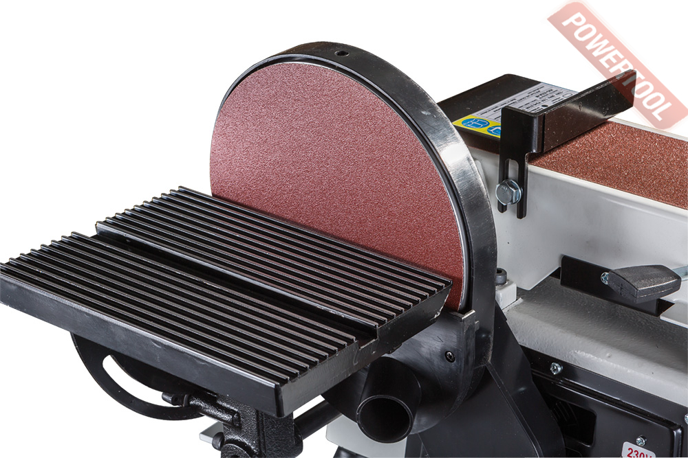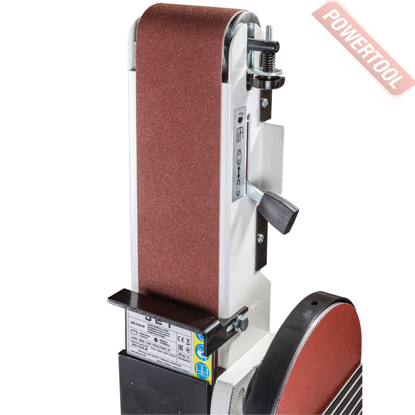 Тарельчато-ленточный шлифовальный станок JSG-233A-M для профессионального применения в частных столярных мастерских. Это относительно компактная модель, предназначенная для настольного размещения, но сделанная точно и основательно. Корпус выполнен литым из чугуна, что повышает устойчивость и способствует снижению вибраций при работе. Рабочий стол из алюминиевого литья и установлен на мощном поворотном кронштейне с дополнительной опорой, увеличивающей жесткость. В зависимости от необходимости его монтируют напротив тарельчатого или ленточного шлифовального узла.