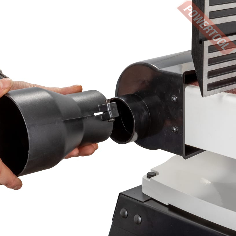 Оба шлифовальных узла оснащены патрубками подключения к системам пылеотвода. Ленточная сторона – на выбор 63 или 100 через адаптер(входит в стандартный комплект поставки) и 37 мм – дисковая сторона, тут скорей подойдет и будет более эффективным стандартный пылесос. Ленточную сторону сразу сможете подключить к любой вытяжной установке.