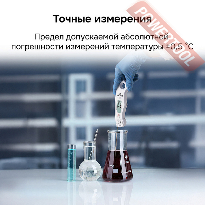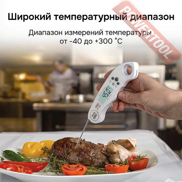Контактный погружной пищевой термометр, внесён в госреестр СИ РФ, диапазон измерения от -40 до 300 градусов С, погрешность 2 градуса С при Т от -40 до -30 градусов С, 1 градус С при Т от -30 до -20 градусов С, 0,5 градуса С при Т от -20 до 100 градусов С, 1 градус С при Т от 100 до 200 градусов С, 2 градуса С при Т от 200 до 300 градусов С, температурное разрешение 0,1 градуса С, единицы измерения C/F, фиксация MIN/MAX значений температуры, зонд NTC, длина зонда 113 мм, питание от 1 батареи 3В СR2032, защита от влаги и пыли IP66, индикатор удержания значения, автоотключение, магнитный держатель, габариты ДхШхВ 157х40х18 мм, вес 0,072 кг, элементы питания, поверка.