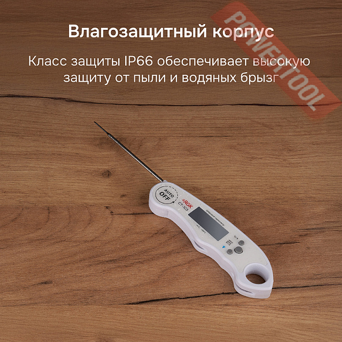 По классу пыле- и влаго-защиты термометр соответствует категории IP66, благодаря чему при загрязнении прибор можно мыть под струей воды. Измерительный зонд изделия диаметром 3,5 мм и длиной 113,4 мм заужен в передней части до 1,7 мм. За счет этого при проверке внутренней температуры кулинарной продукции не портится ее внешний вид.