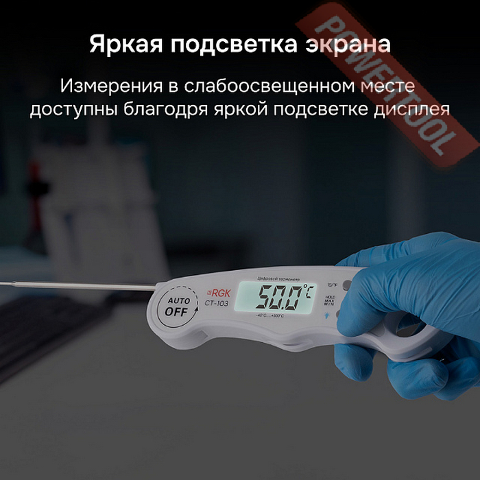 Для упрощения считывания результатов измерений при выполнении замеров в труднодоступных местах цифровой термометр RGK CT-103 снабжен функцией HOLD, при активации которой на дисплее фиксируются текущие показания. Наличие подсветки, которая включается отдельной кнопкой и выключается при ее повторном нажатии либо автоматически через 10 секунд, упрощает выполнение работ в условиях слабого освещения.