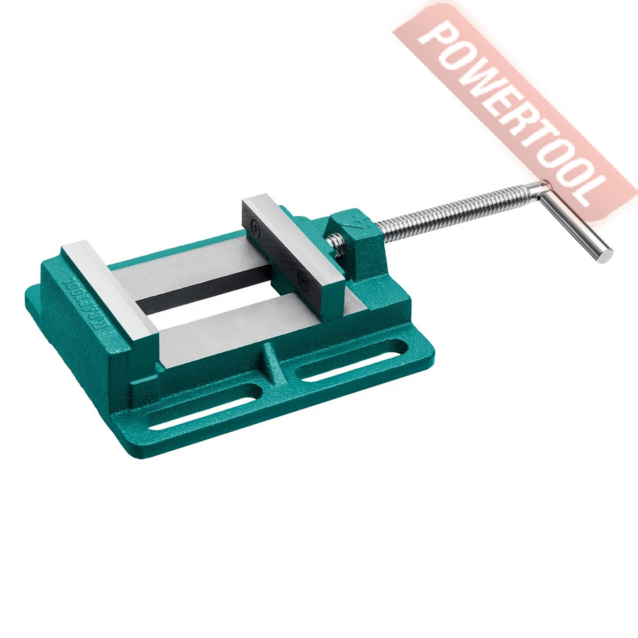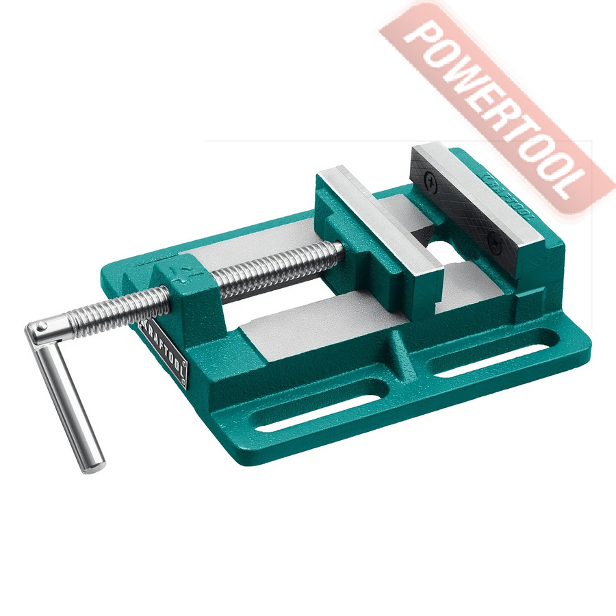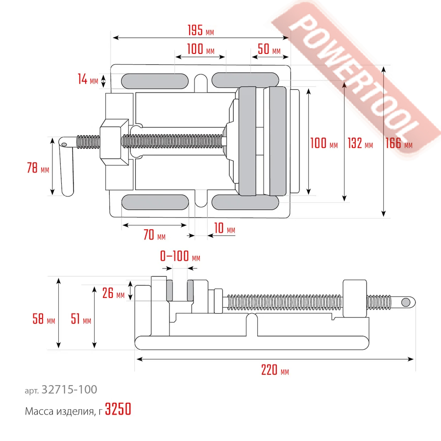 Тиски станочные сверлильные, ширина губок 100 мм, рабочий ход 100 мм, высота губок 26 мм, размер ДхШхВ 220х166х58 мм, вес 3,25 кг.