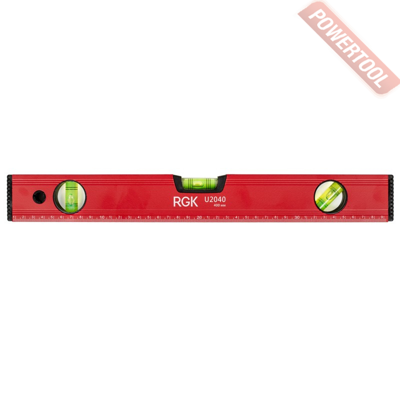 - Линейка с ценой деления шкалы 1 мм сделает удобной разметку поверхностей. Подписи и отметки шкалы белого цвета на строительном уровне RGK U2040 выполнены методом гравировки и не истираются при контакте с такими поверхностями, как бетон или дерево.