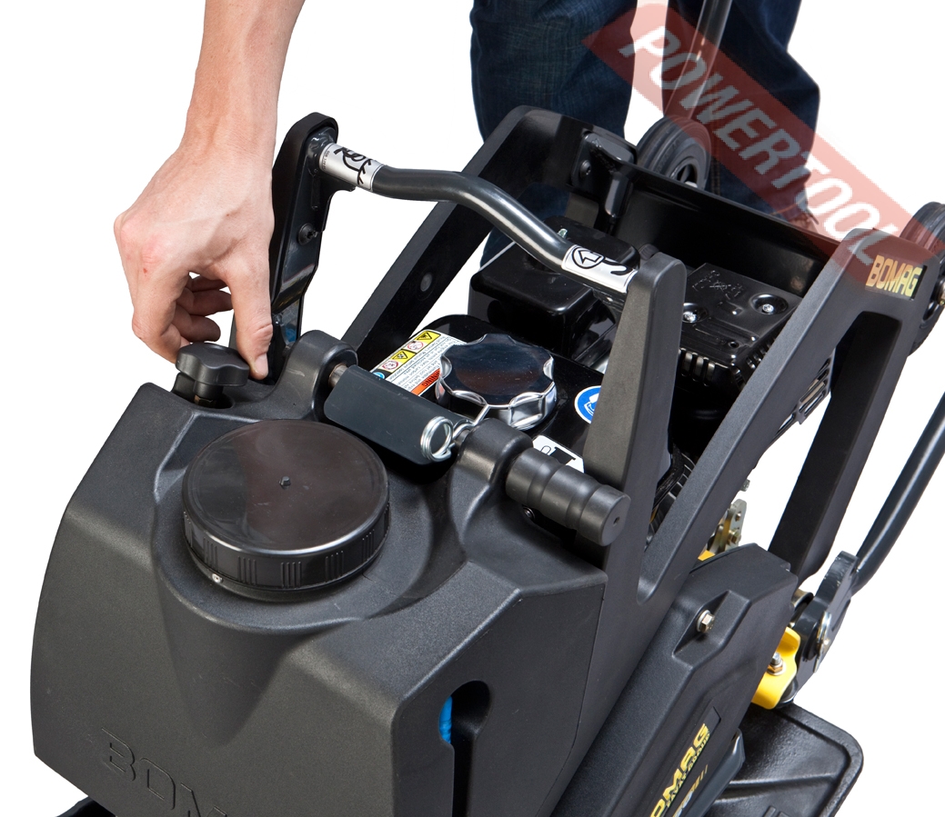 - Для работы по асфальту плита может быть опционально оснащена баком для воды с системой орошения. Бак нержавеющий, быстросъемный, имеет большую вместимость и индикатор уровня воды. Оператор может точно регулировать расход воды.
