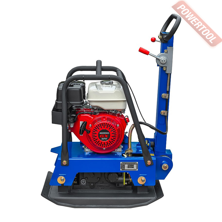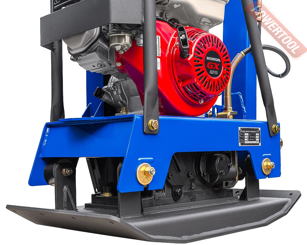 Виброплита реверсивная, вес 161 кг, плита 785х480 мм, усилие уплотнения 30,5 кН, механический привод, скорость перемещения 40 м/мин, производительность 1152 кв.м/ч, частота вибрации 80 Гц, 4-тактный бензиновый двигатель Honda GX270 объемом 270 куб.см и мощностью 8 л.с., топливный бак 5,3 л, расход топлива 2,4 л/ч, емкость картера 1,1 л, защитная рама, размер упаковки 750х455х1120 мм.