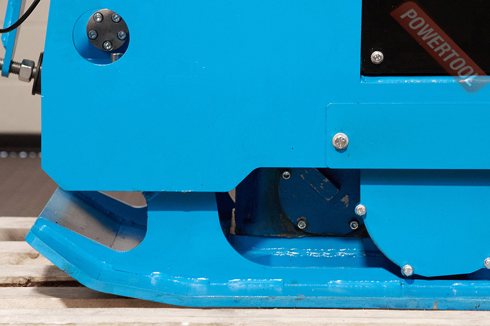 - Литая рабочая подошва плиты способна принимать повышенные нагрузки и эффективно передаёт вибрацию от эксцентрика.