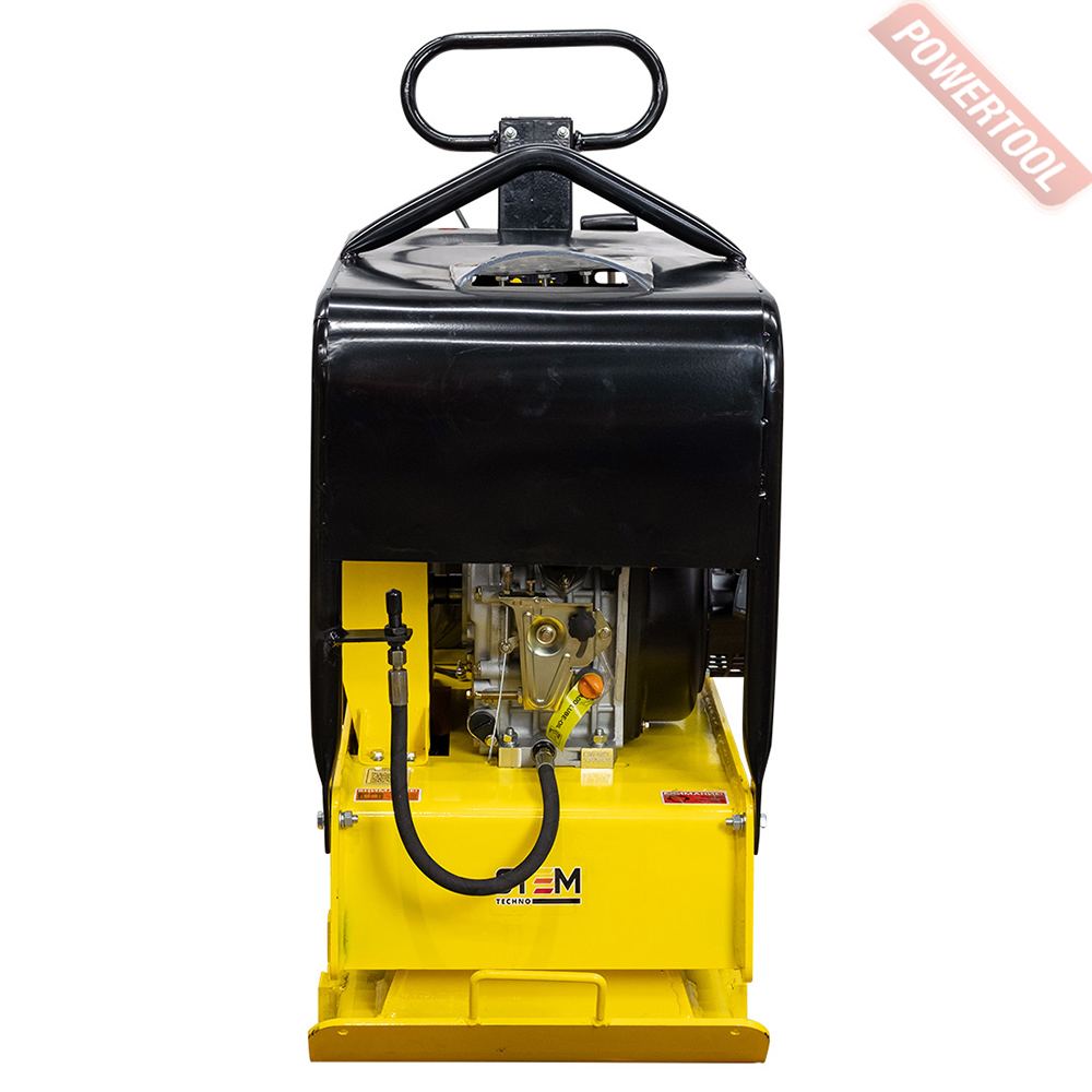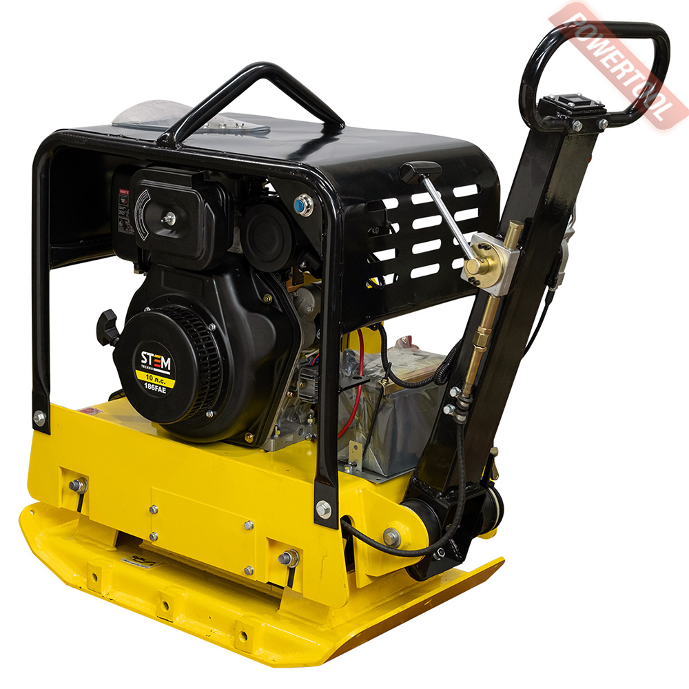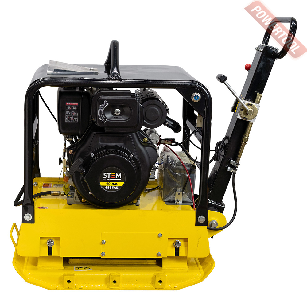 Виброплита реверсивная, вес 260 кг, усилие уплотнения 50 кН, рабочая поверхность 840х660 мм, механический привод, скорость перемещения 15 м/мин, 4-тактный дизельный двигатель STEM Techno S186FAE мощностью 10 л.с. с электростартером, размер ДхШхВ 1030х535х1010 мм, транспортировочные колеса.