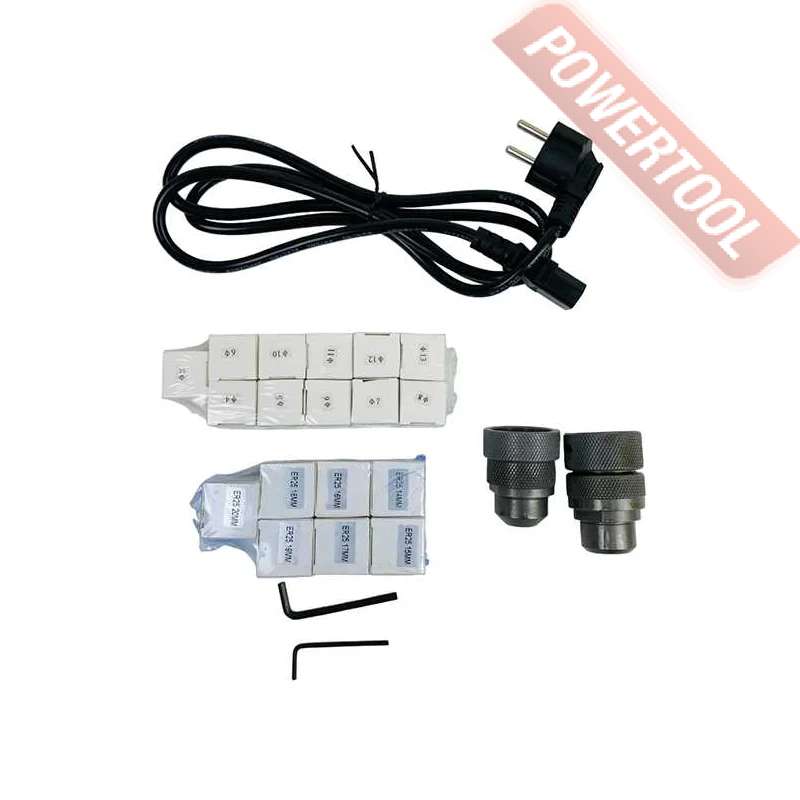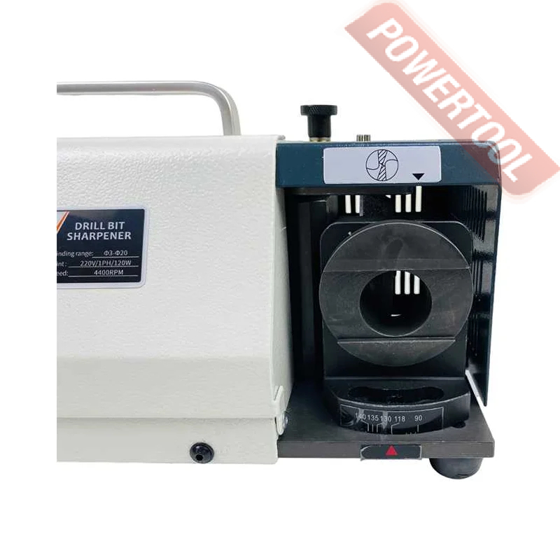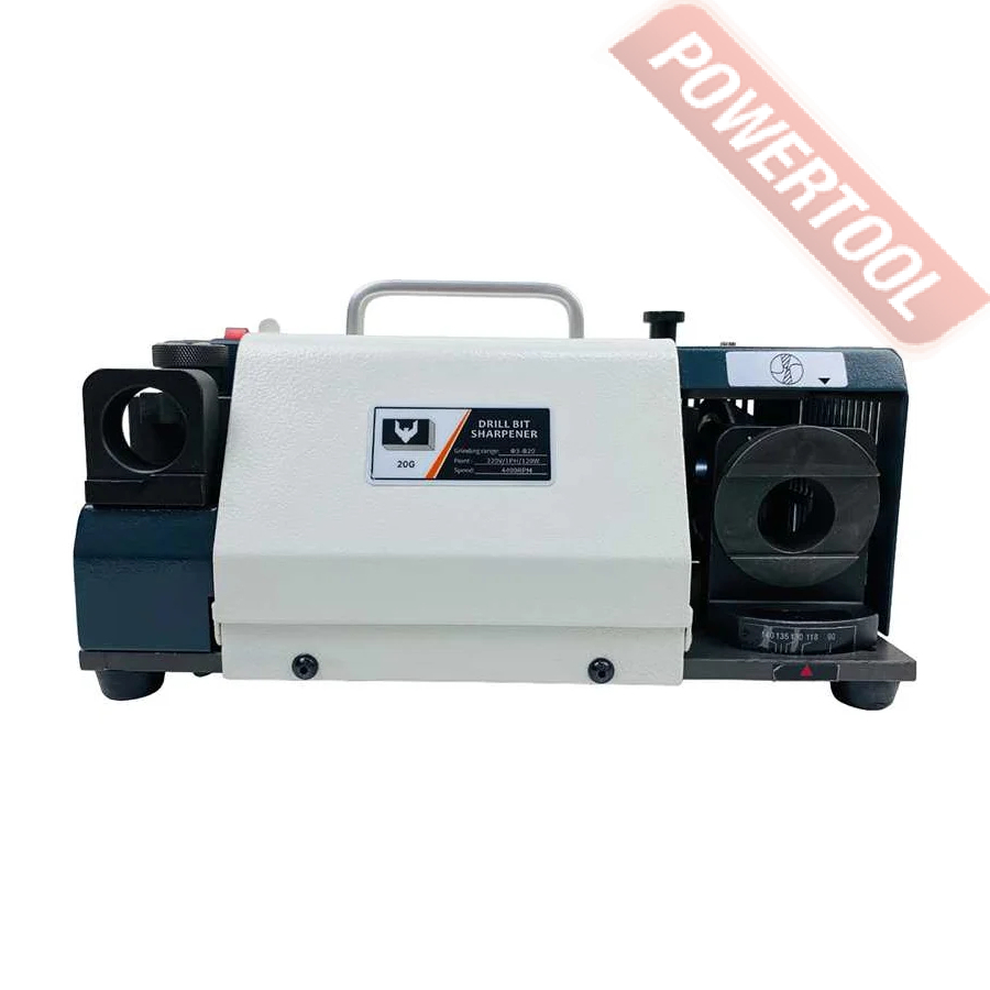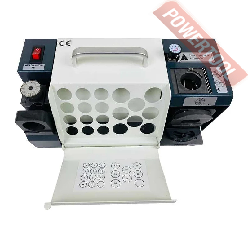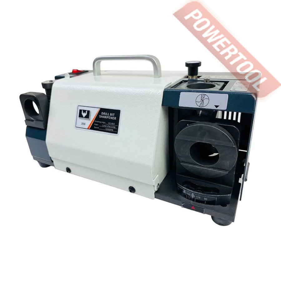 Заточной станок для заточки сверл, мощность 120 Вт, напряжение 220 В, число оборотов 4400 об/мин, диаметр затачиваемых сверл 3-20 мм, угол заточки сверла 90-140 градусов, вес 10 кг, заточной диск CBN для быстрорежущей стали, цанговый патрон ER20, цанговый патрон ER25, комплект цанг ER20 3-13 мм 11 шт, комплект цанг ER25 14-20 мм 7 шт, набор шестигранников.